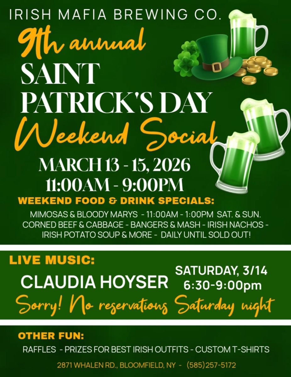 It's that time of the year again! We are gearing up for our St. Patrick's Weekend party!! Food and drink specials, live music from Claudia Hoyser, raffles, best dressed contests, and more!! Come join us for a good party with good food, good drinks, and good people!