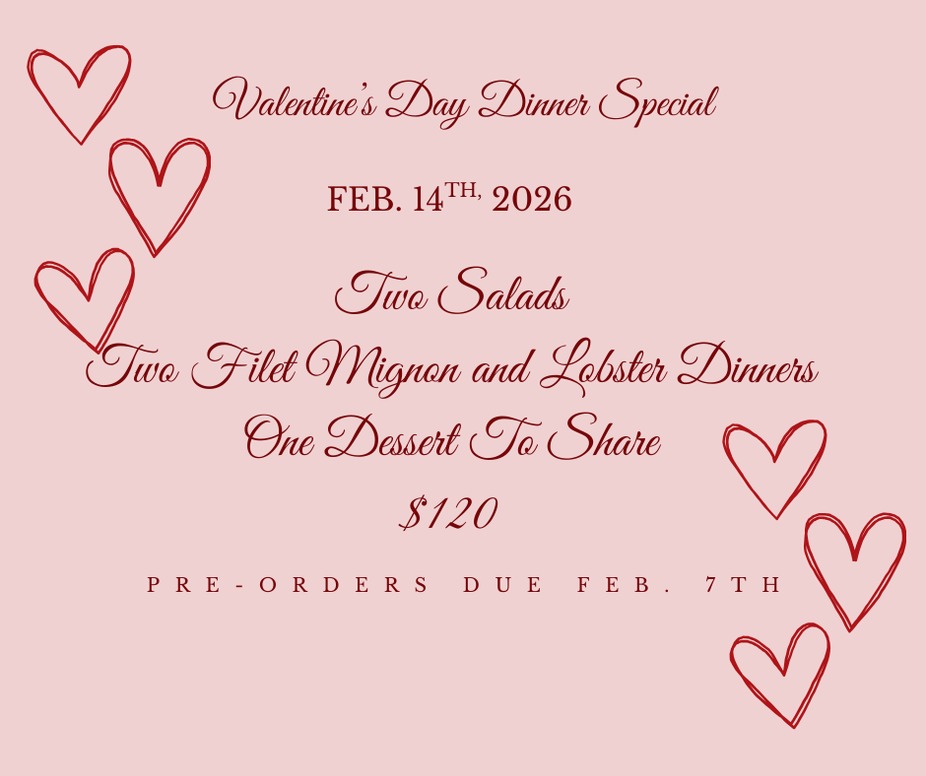 Join us for Valentine's Day Dinner Special! This Special includes: Two Salads, Two Filet Mignon and Lobster Dinners, and One Dessert to share, all for $120! Orders are due by Feb. 7th! Place your order by calling into the Mafia today!